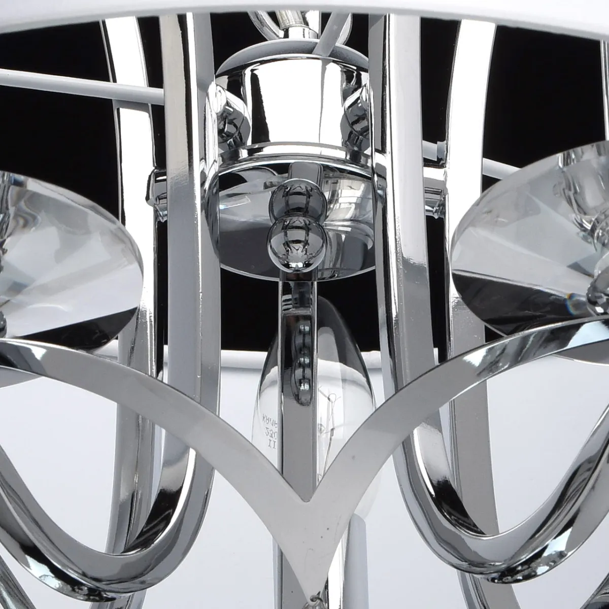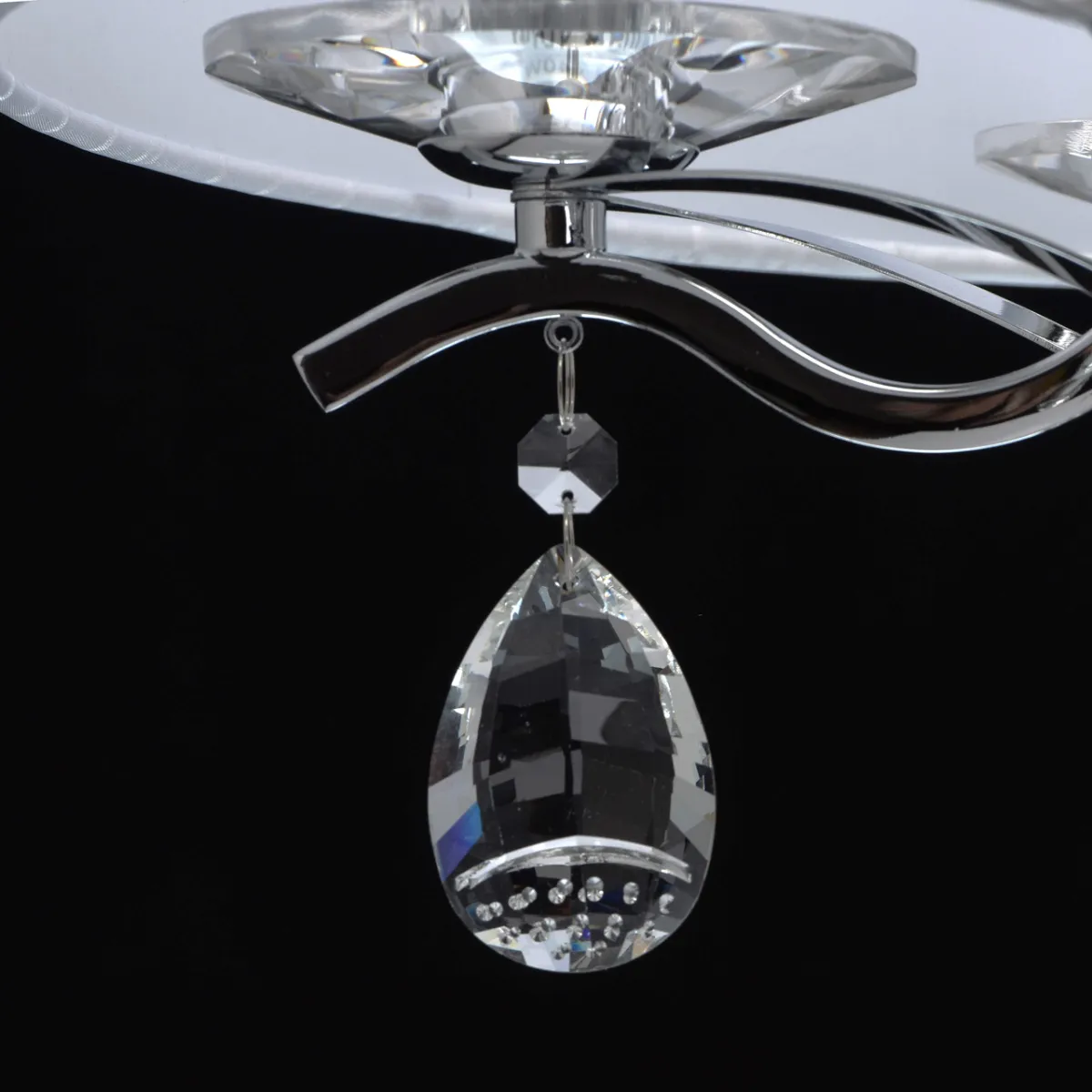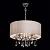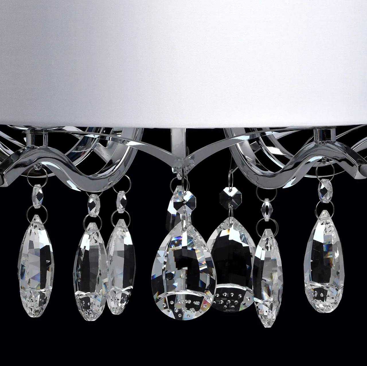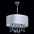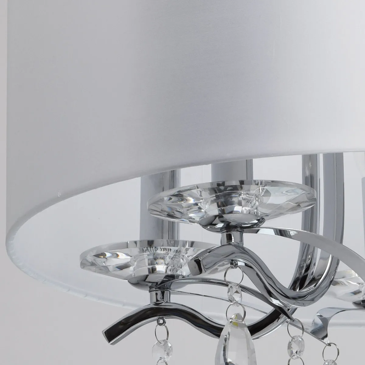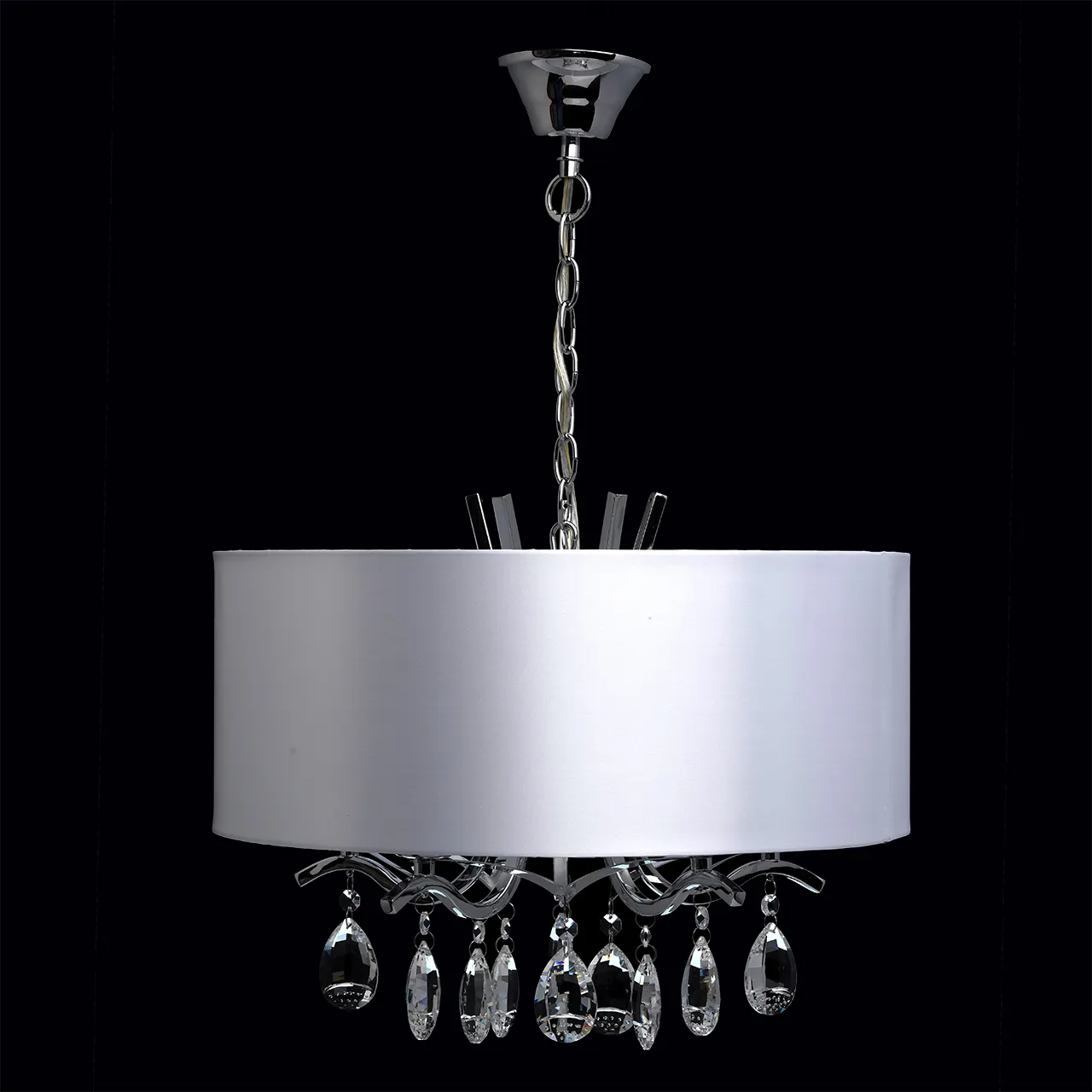 Основание из металла цвета хрома, текстильный абажур из атласа, декоративные розетки и подвесы из хр