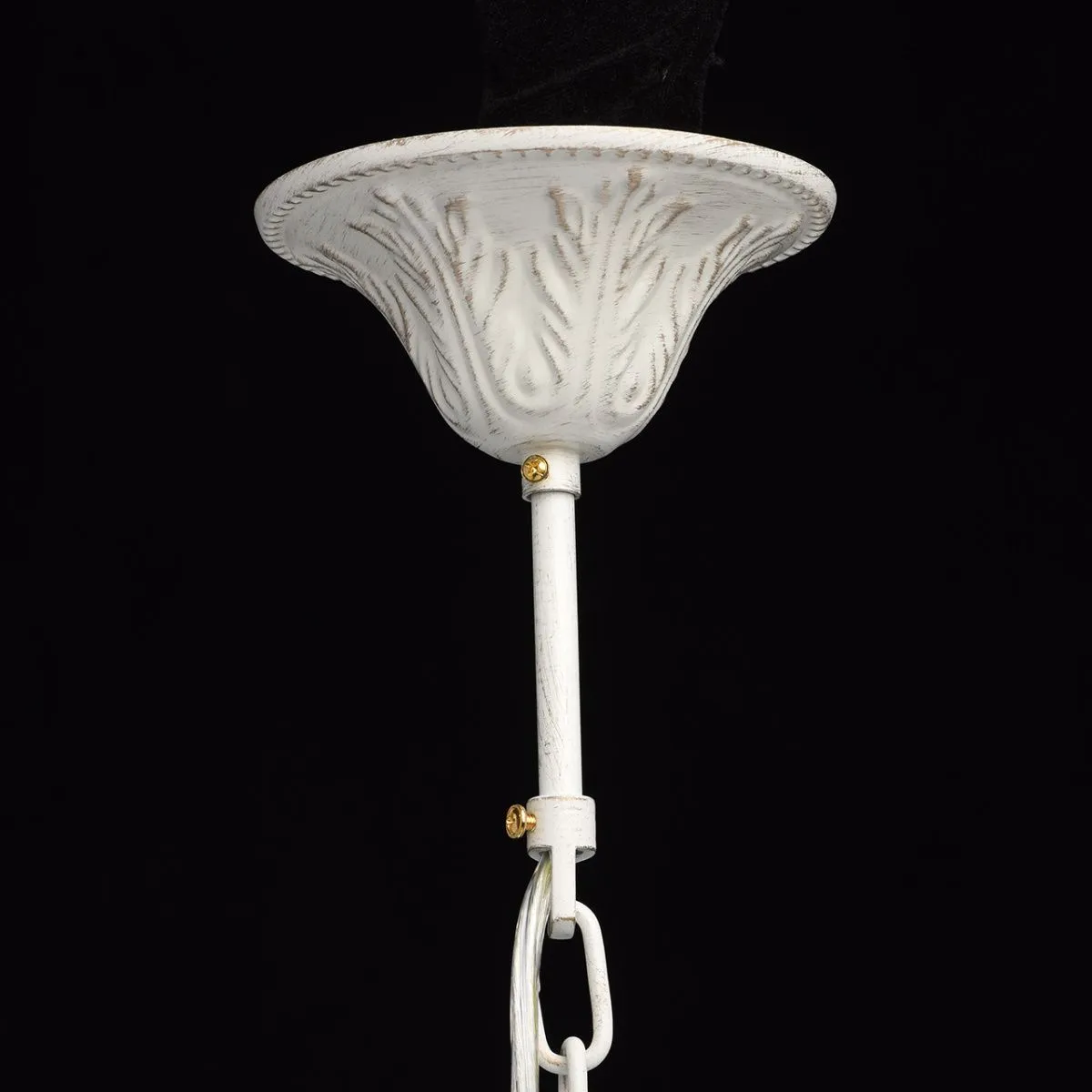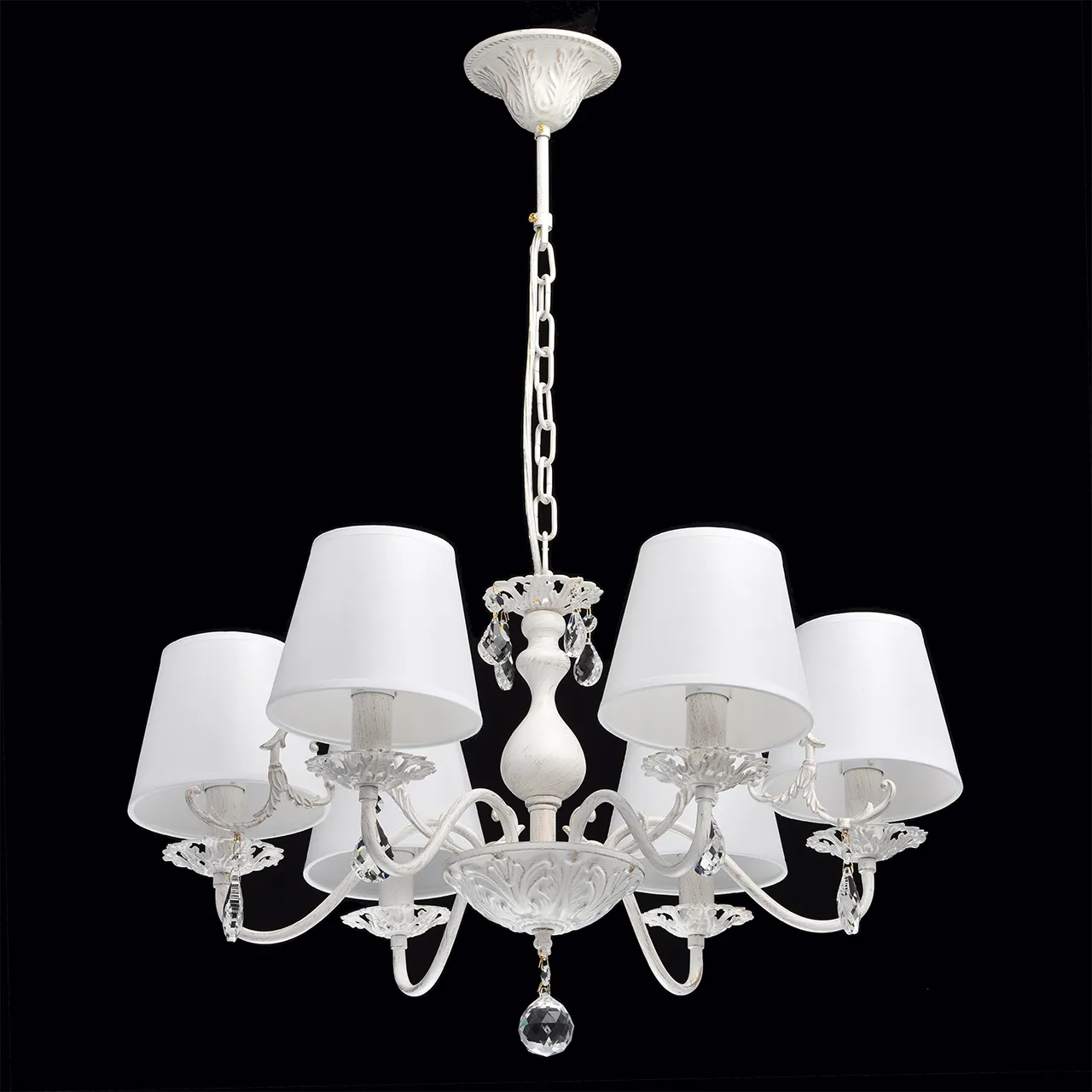 Металлическое основание окрашено в белый цвет с золотистой патиной. Абажуры - текстиль белого цвета.
